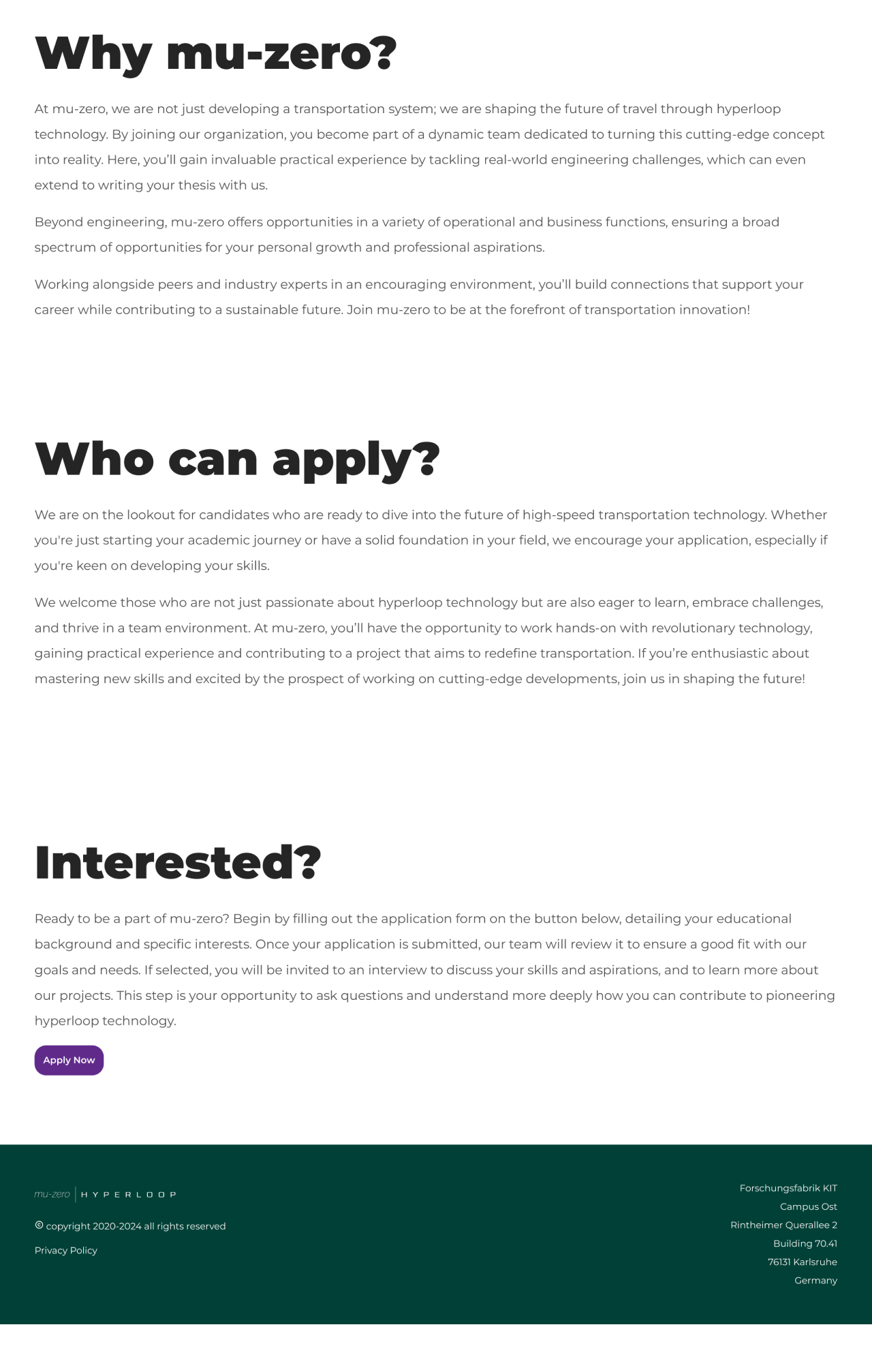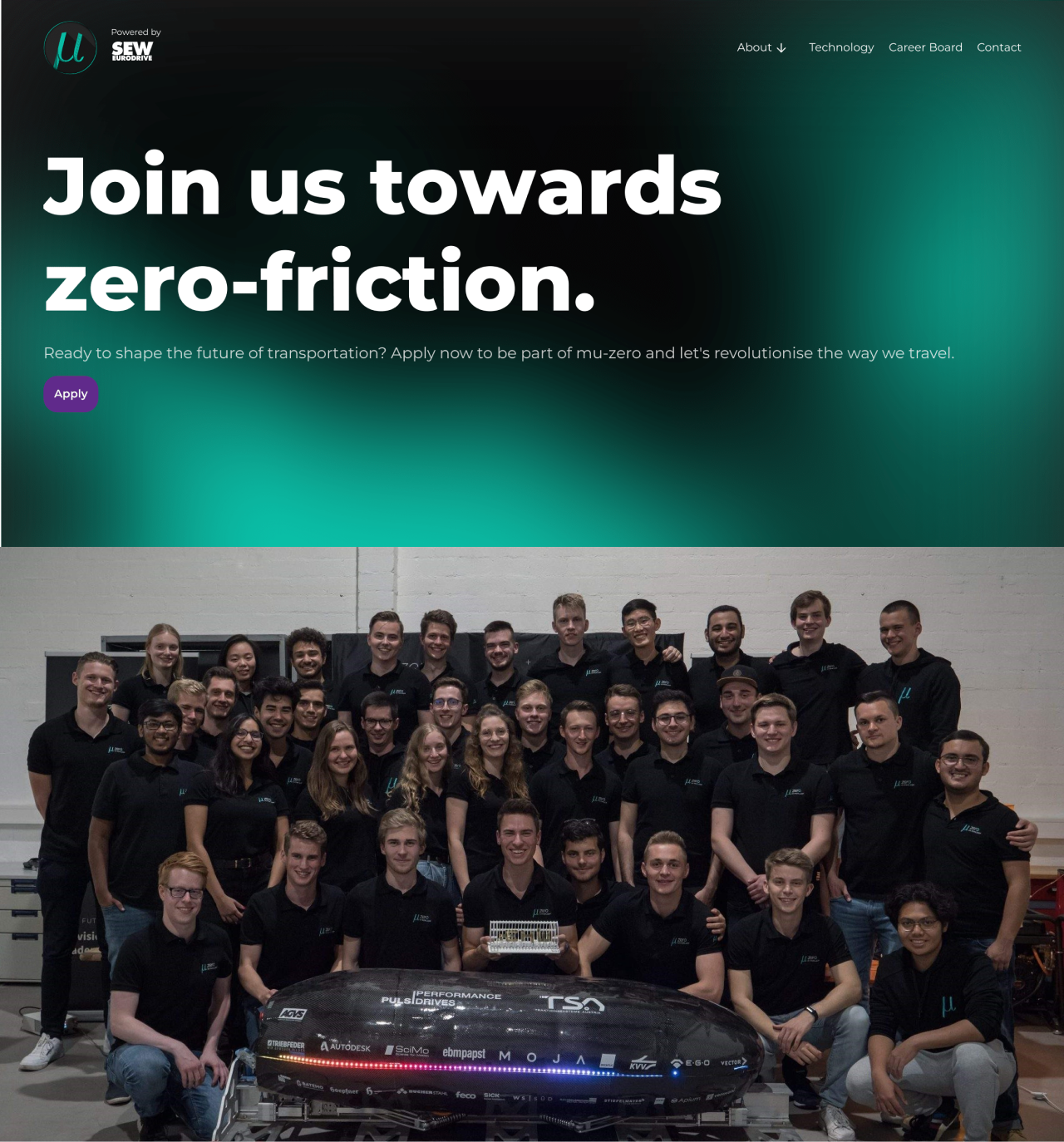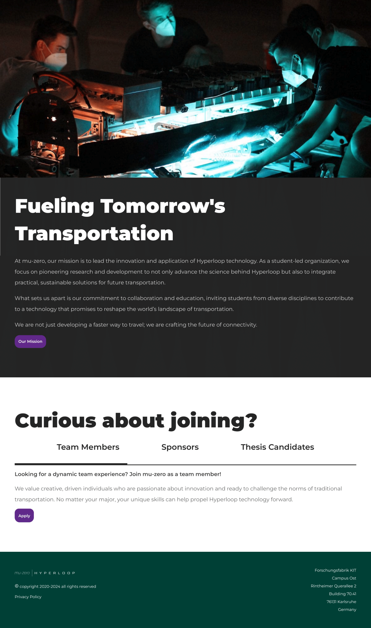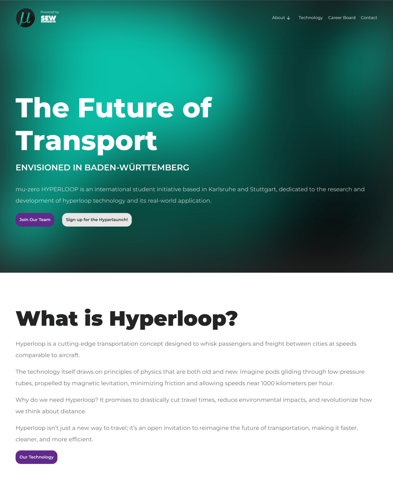 Overview: mu-zero Hyperloop is an organisation based in Karlsruhe and Stuttgart, Germany. They work on the research and development of hyperloop technology, known as the fifth and newest form of transportation, and present a new cutting-edge prototype each year. They aim to contribute to a more sustainable future and pride themselves on their collaboration, working together to push the boundaries of technological advancement. As part of the marketing team, I designed and developed a brand-new website.