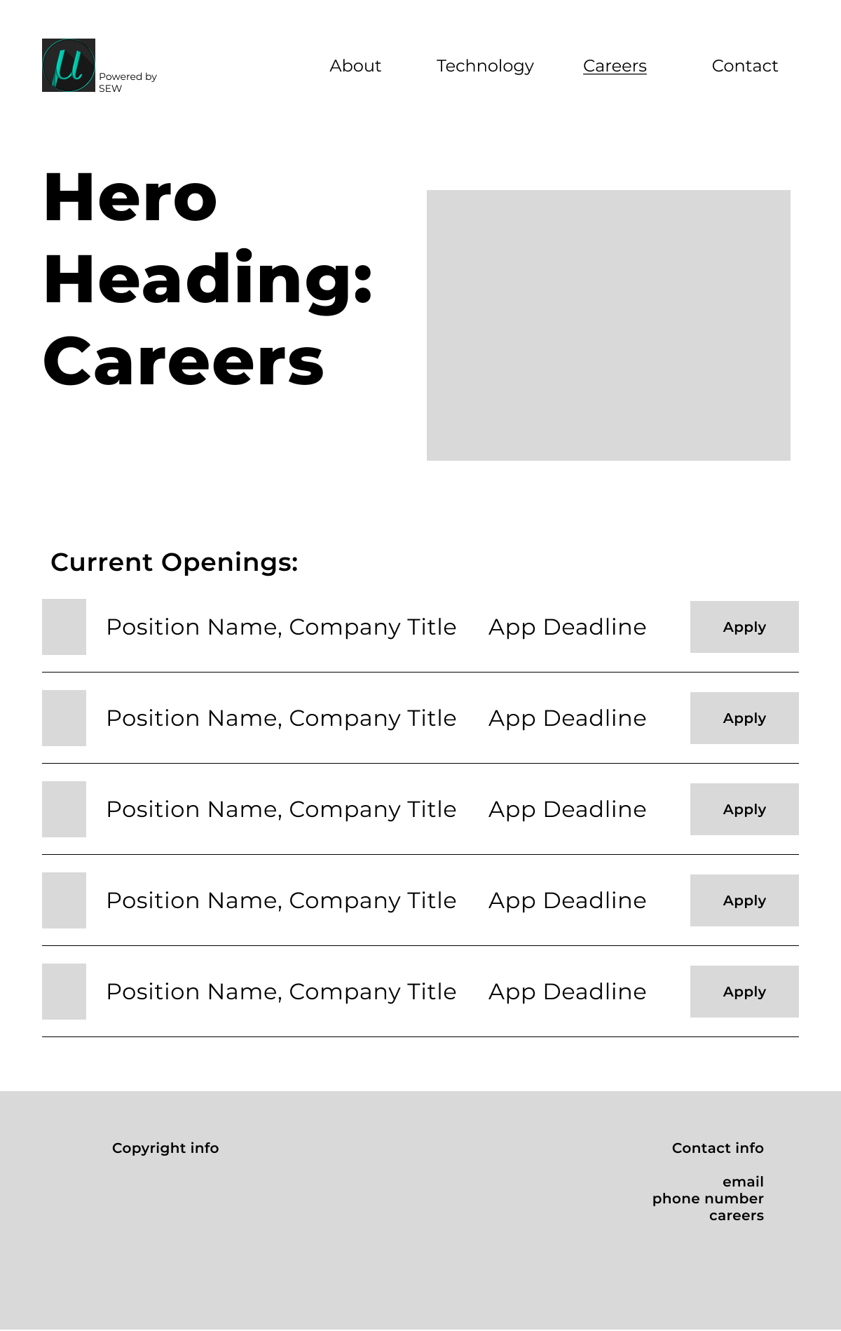 As part of mu-zero’s agreement with their sponsors, the website must include a section for job opportunities. Not only is this a chance for companies to recruit some of the best upcoming talent, but also for students to find companies that can help them succeed in their chosen career field. The page had to be simple, and portray all the needed information, as well as be easy to find.